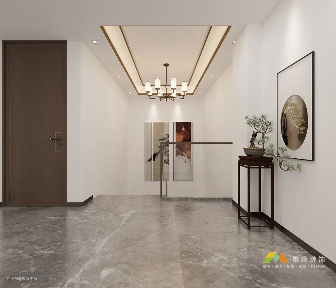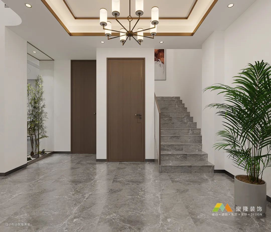 楼梯间轻盈都是韵味,回字形悬浮吊顶搭配中式灯,地面通铺灰色系600*1200㎡地砖,高级大气。