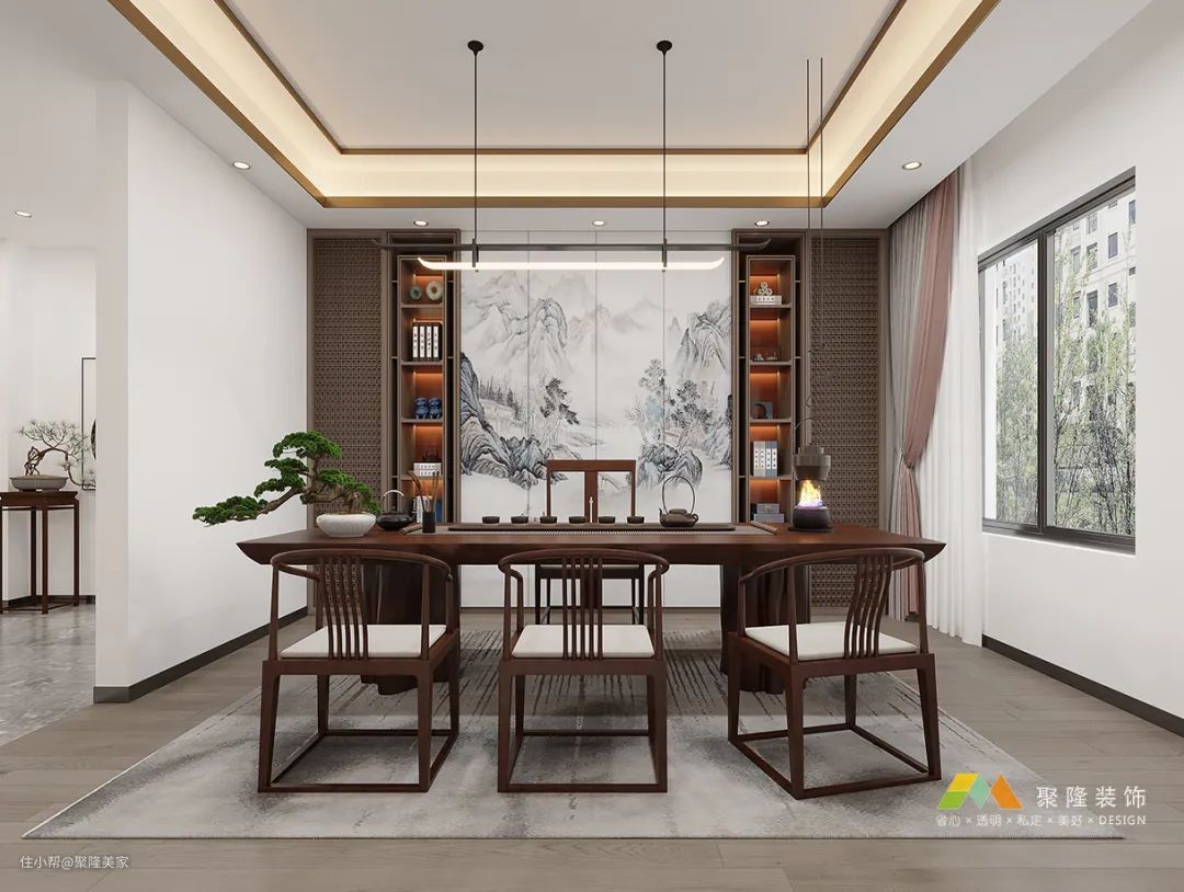 茶室的静谧给业主一个自我思考的空间,中式回形格栅元素搭配部分开放格,既有中式雅韵又兼具现代时尚。