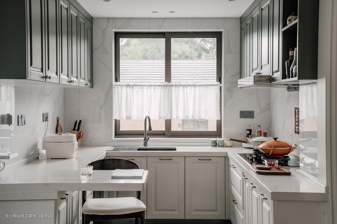 由U型厨房的操作台一侧设计出精巧的吧台,巧妙丰富餐厨空间的整体功能,是烹饪操作台面的延伸,也可以充当备餐区、早餐台、阅读吧台等功能角色。