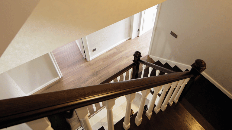 楼梯串联起上下空间,白色与木色交织的配色简而有味,光影流转之下,越显沉稳雅致,契合了整屋的大气格调。