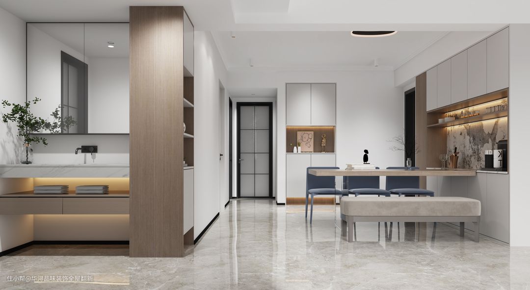 洗手台外移至公共区域,通过储物柜进行阻隔。卫生间不同功能区互不干扰,提高生活效率。另外,墙排龙头的设计,可以避免传统形式的水龙头和台盆交接处容易滋生细菌,不好清理的问题。