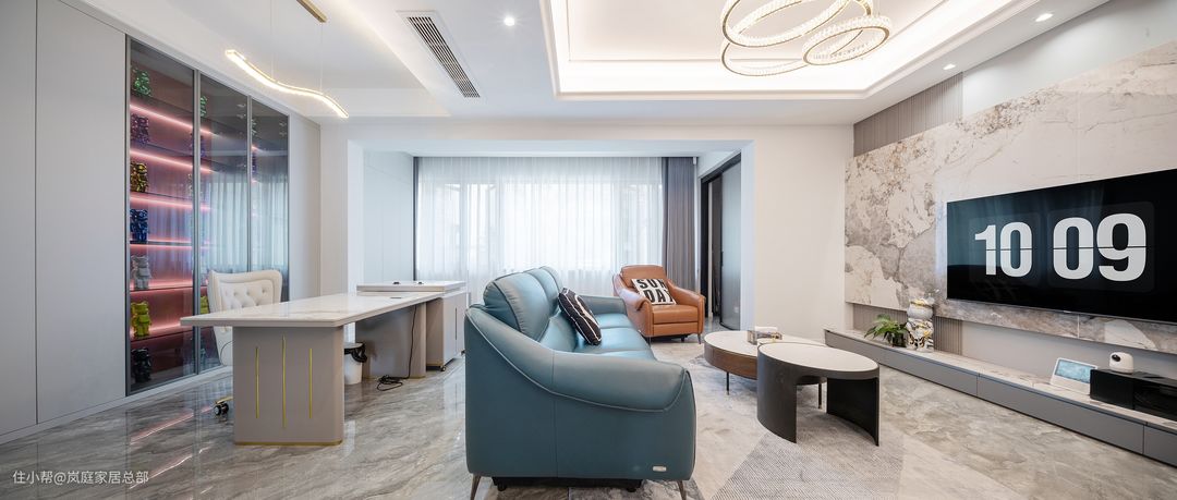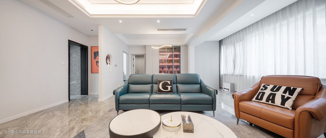 业主一家家居品位的要求比较高,尤其喜欢年轻流行时尚的质感。所以可以看到在软装家具的搭配上选用的都是明亮度较高的色调,绅士蓝色的皮质沙发,沉稳大气感十足。