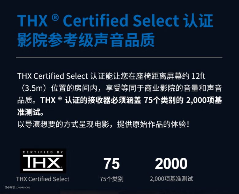 另外值得一提的是THX认证,要知道制造商可不能给自己产品颁发,也不能简单地通过付费获得认证。带有THX标志的电子产品必须要经过一长串的测试(例如一个家庭影院功放甚至要经过2000多次测试),保证让你在家里也能获得电影院级别的声音品质,获得最佳的观影感受及沉浸式的电影体验,显然如今THX认证也已然成为电影院和家庭影院领域的一个标杆。