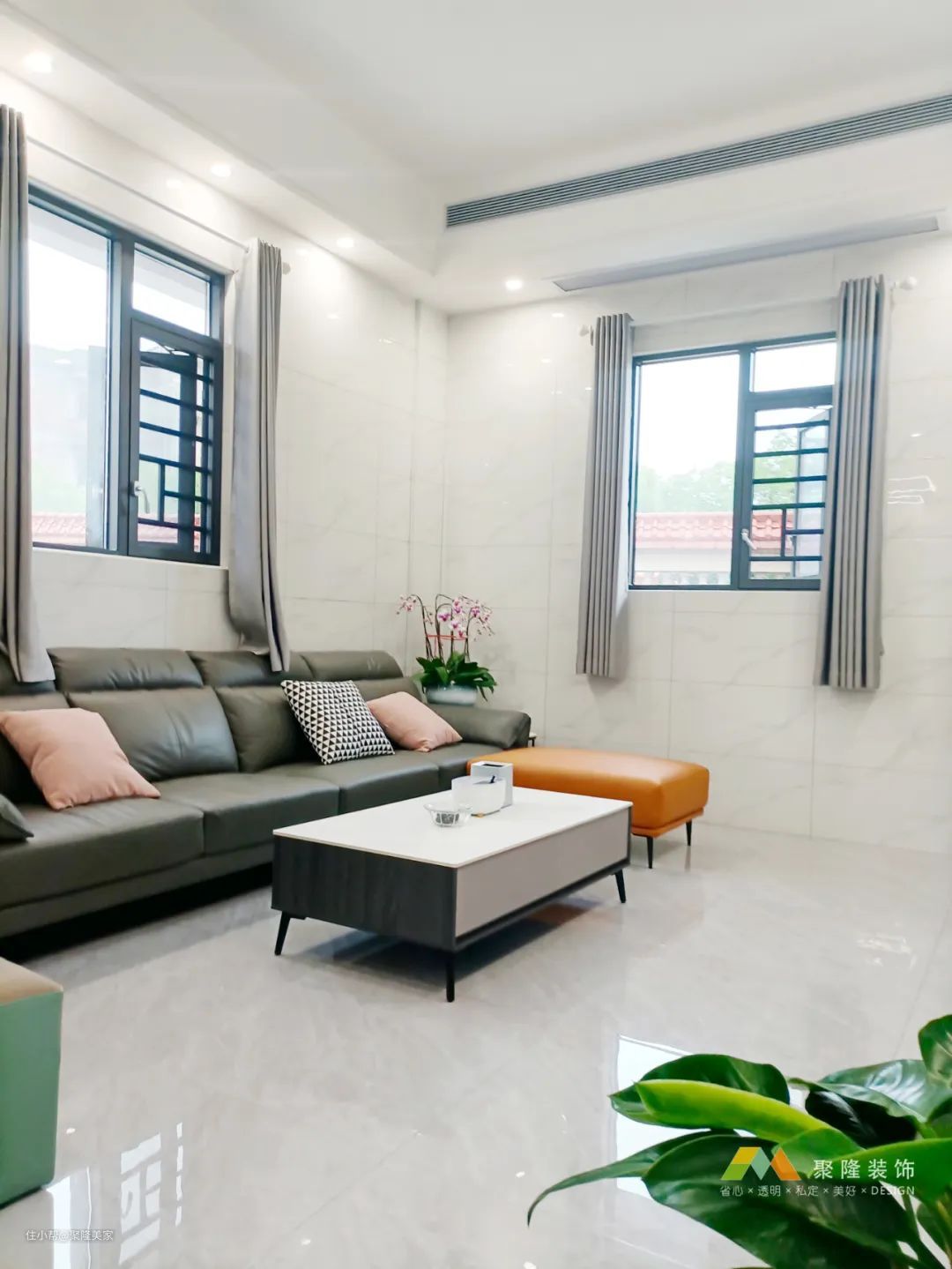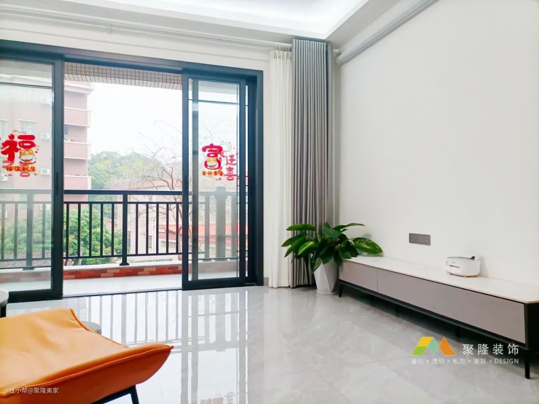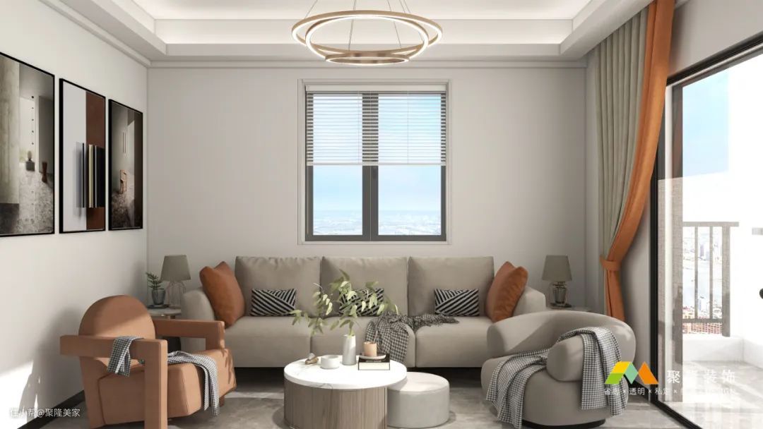 客厅回字形双眼皮吊顶+嵌入式风管机,简约大气,视觉上提升层高;两墙均有窗户,室内采光充足明亮。