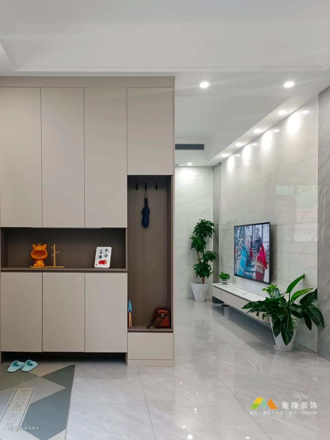 一楼玄关充当客厅这个空间的隔断,让整体区域分明;底部预留20公分收纳鞋子,实用性强。