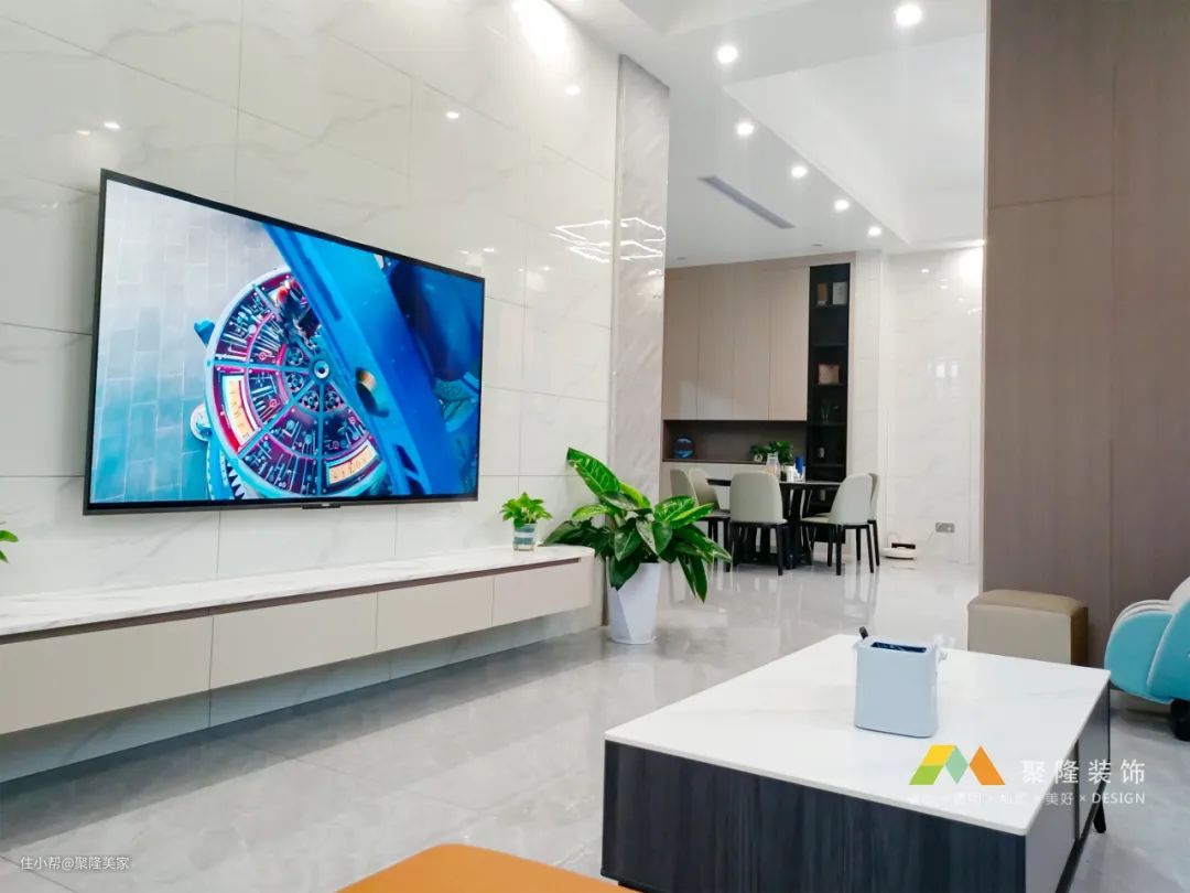 二楼客厅未做电视背景墙,白色乳胶漆通刷,下方是电视矮柜,自动投影仪幕布悬空顶部,24小时陪伴模式的电影氛围感拉满。