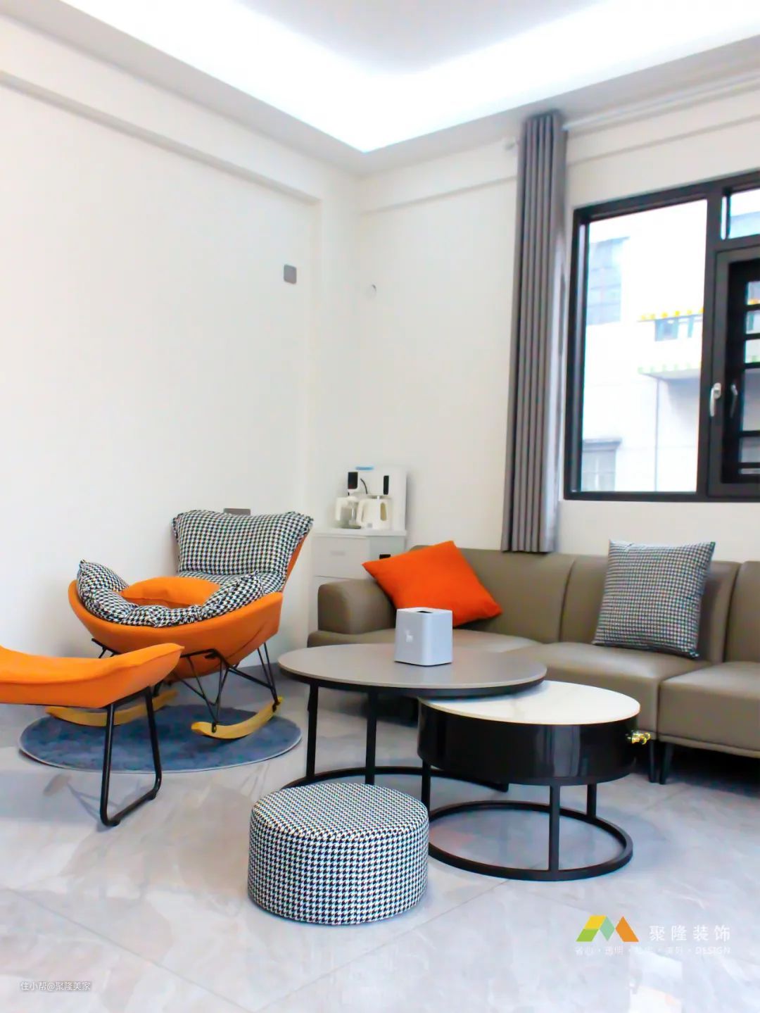 延续一楼客厅的同色系皮质沙发,灰白叠级圆形茶几,与爱马仕沙发摇摇椅勾勒出一副惬意的生活状态。