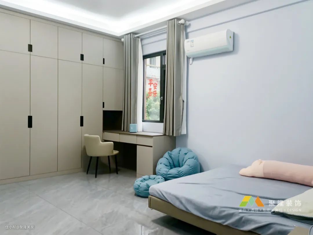 床头是通顶衣柜,衣柜延伸出书桌,与窗户相对,当卧室小主人学习疲惫可以眺望窗外,给眼部放松。