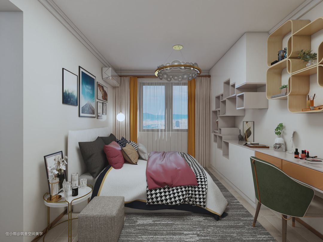 主卧依旧沿用客厅浅色主题色,点缀装饰画以及拼色窗帘的橘黄色来提亮空间。简洁且舒适!