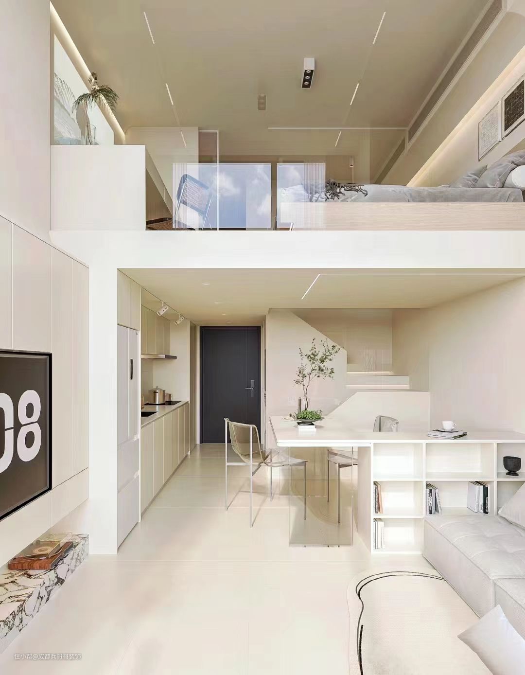 公寓层高在3.9米以上都会搭建隔层,卫生间一般在一楼,也可以在二楼设计卫生间,这就涉及到层高分配是否合适。例如一楼层高2.1,二楼层高1.9,再加上隔层厚度。