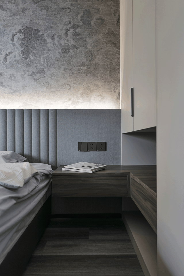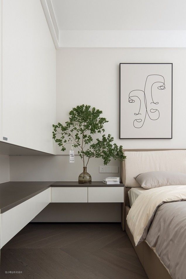 不影响柜门开关,借用衣柜的部分,做床头柜的台面延伸。