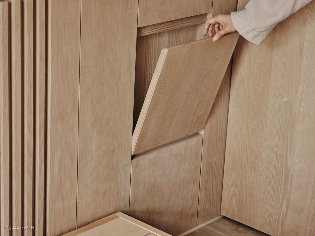 墙面设置可上下翻折的隔板,需要置物时,直接翻下使用,利用墙面空间增加收纳.
