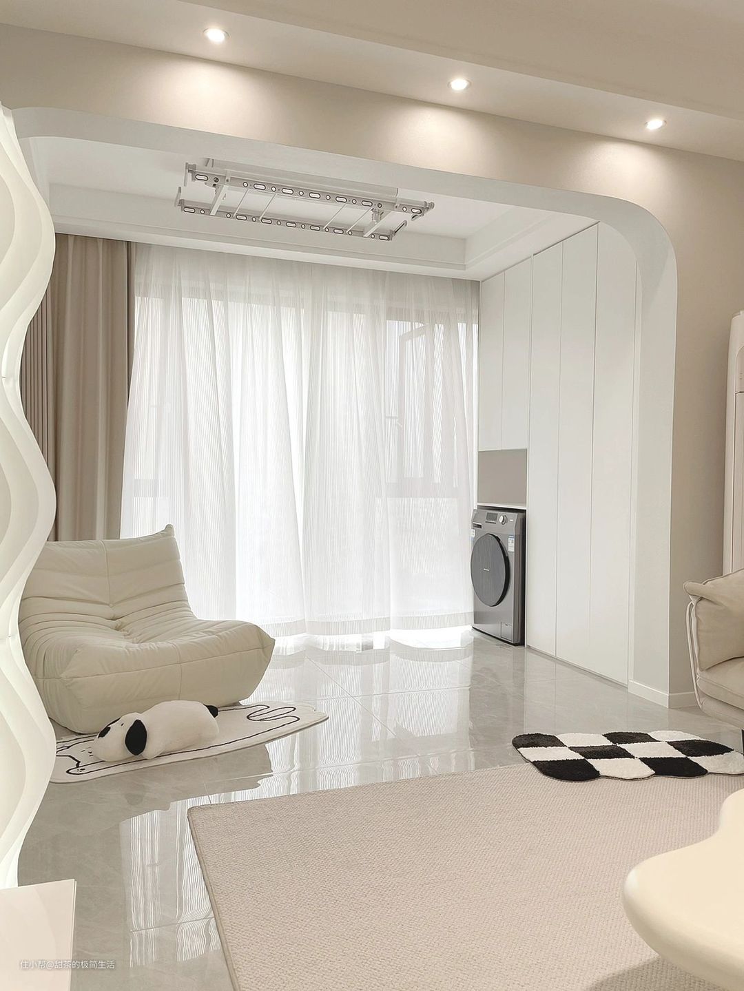 吊顶做了一圈边吊设计,中间安装智能升降晾衣架,隐形效果不错,很美观。