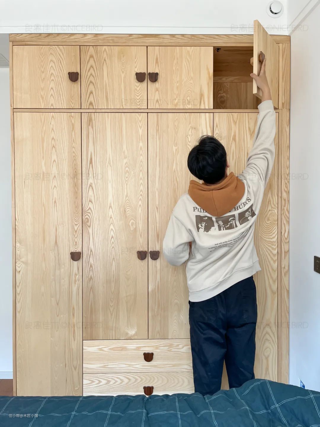 通常儿童房都用白蜡木,房间不大,只放了一个衣柜和床,简简单单,等软装配饰丰富后会更有层次感▽
