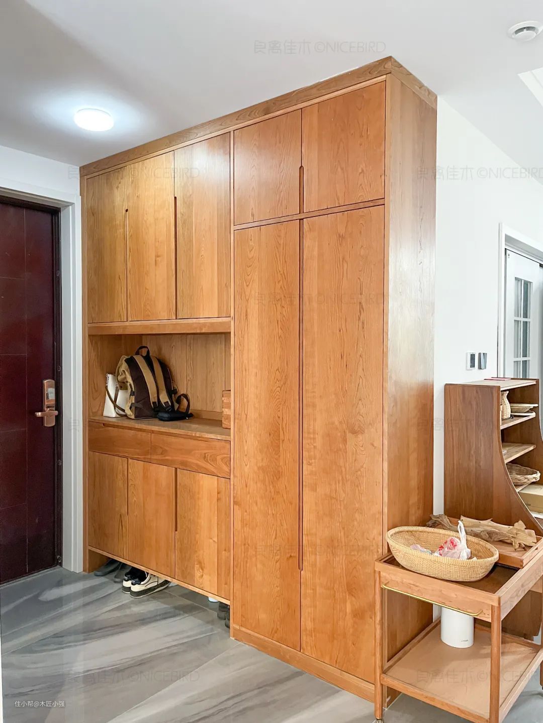 进门柜也是樱桃木材质,和客餐厅的家具风格一致,一侧收纳鞋一侧放外套,中间留出一部分台面,方便从外面回来随手放东西 ▽