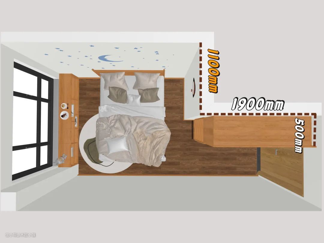 进门这面墙长度是1.9米,转过来那面墙是1.1米,衣柜当然是越大越好啦,所以柜子就摆在了进门处,房间宽敞了,也就有了飘窗柜的出现,可以坐在上面读书喝茶看风景▽