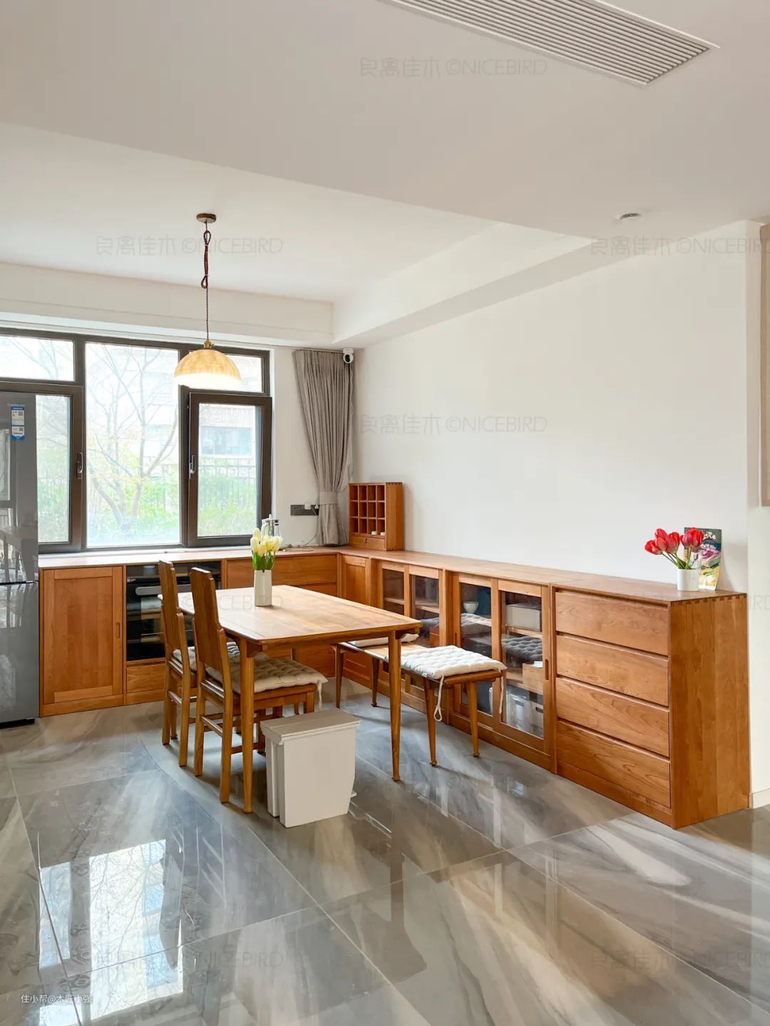 客厅的另一侧是餐厅,依旧温馨色调,合理利用空间打造L型餐边柜,台面方便随手放物品。生活是需要仪式感的,放几株郁金香,坐在这里和家人吃饭聊天一定很幸福吧!▽