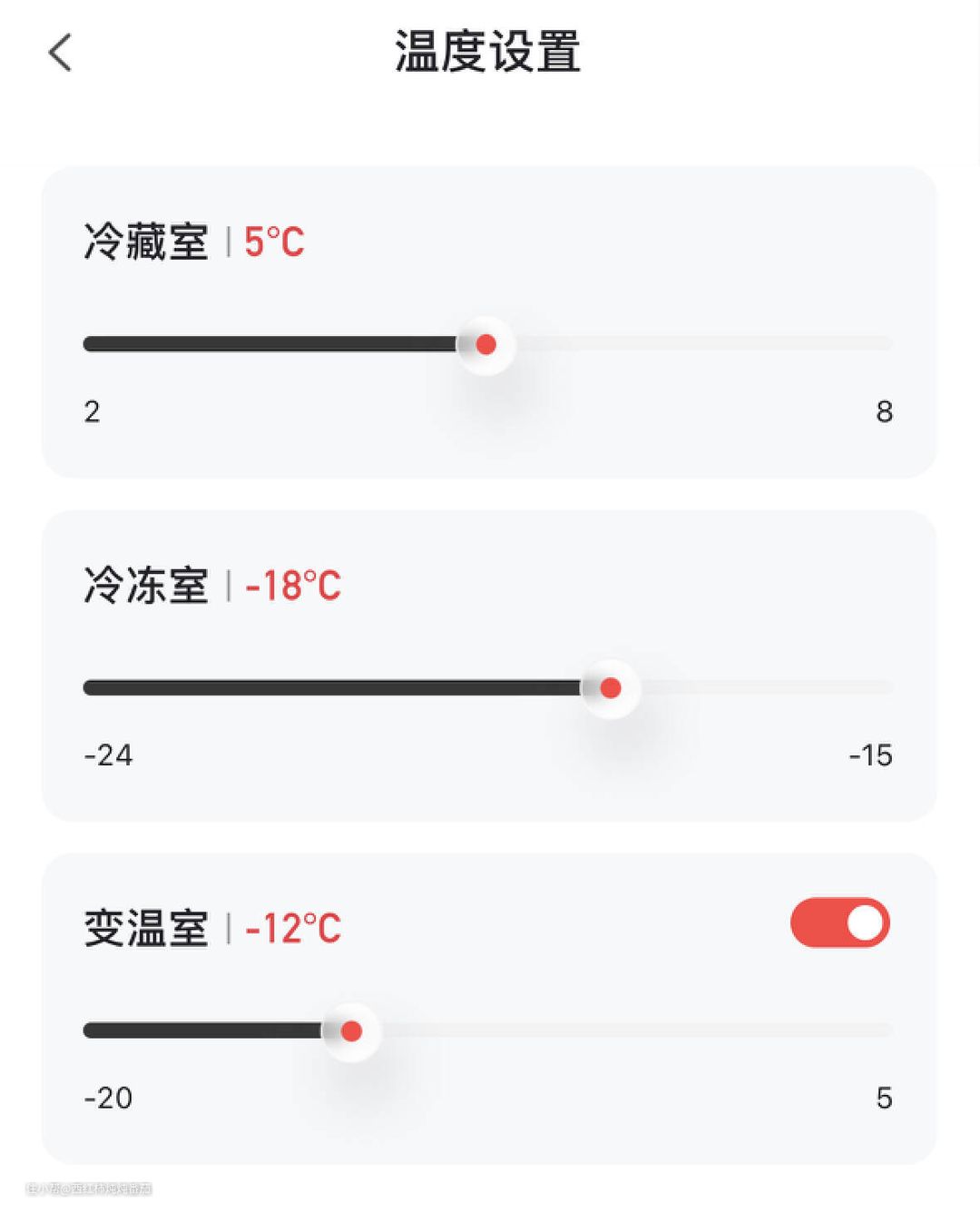这台TCL超薄零嵌冰箱T9的冷藏室温度可以在 2-8℃之间随意设定;冷冻室可以在 -24- -15℃之间自由切换;而变温室的控温区间更是达到了惊人的 -20-5℃,跨度足足有 26℃,所谓“宽幅变频”名副其实 ▲