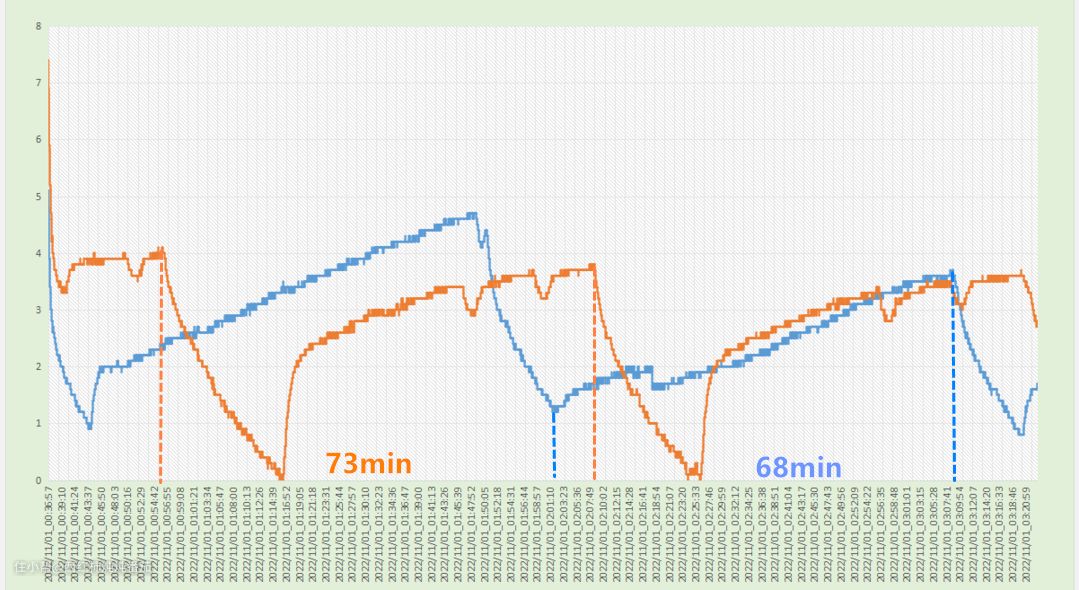 橙色和蓝色的曲线分别代表一台冰箱,实测的都是冷藏室温控曲线,且设定温度都是 5℃。