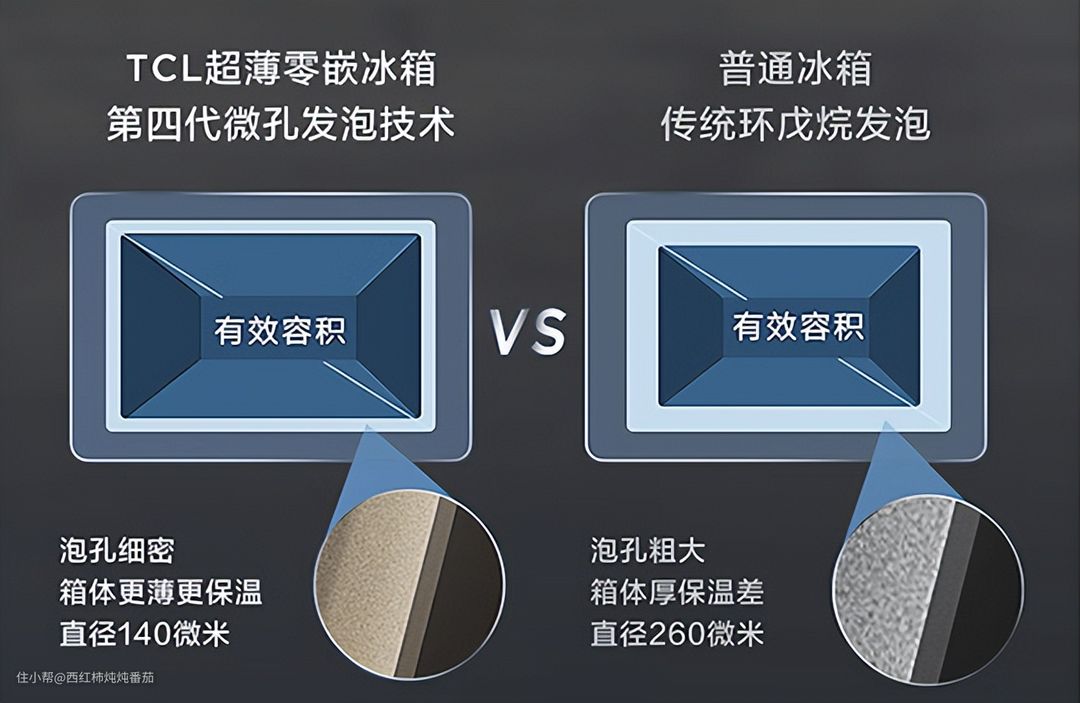 帮助TCL超薄零嵌冰箱T9实现“以小博大”的秘密则是 TCL的第四代微孔发泡技术。该材料取代了传统环戊烷发泡保温层,可以以更小的体积,实现相同的保温效果。