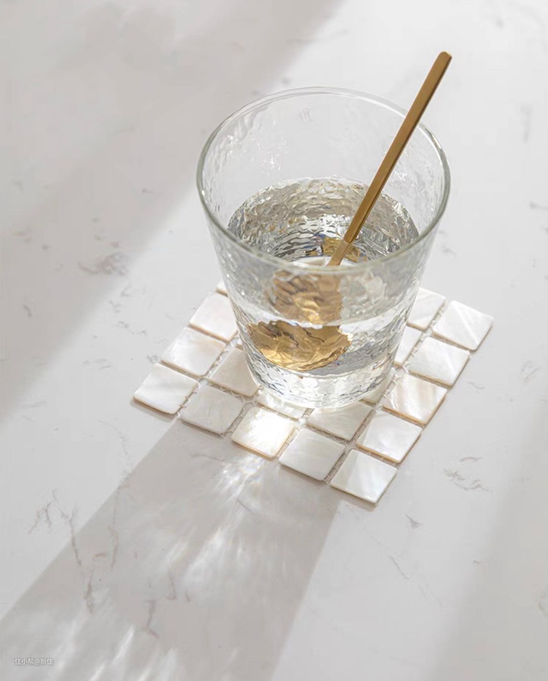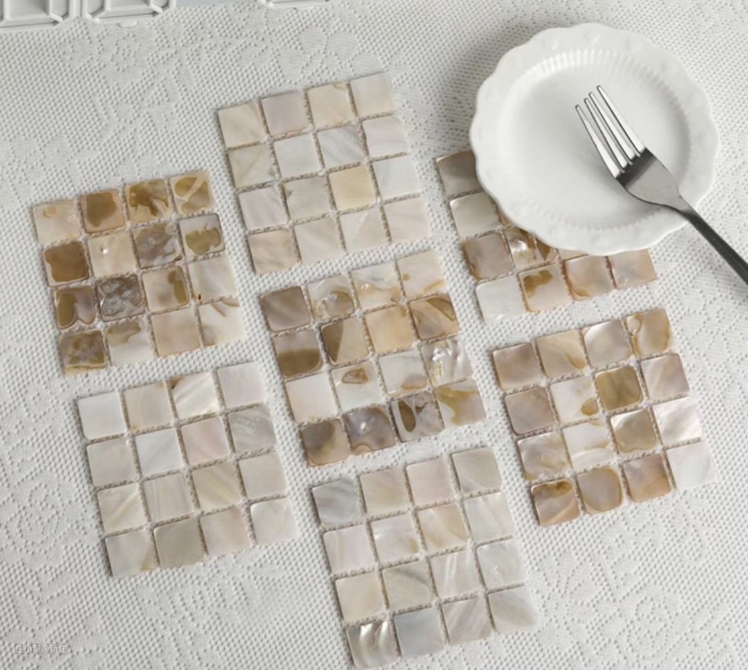 作为实用性的杯垫,它是天然的贝壳打磨、拼接而成,外观色泽十分高级。