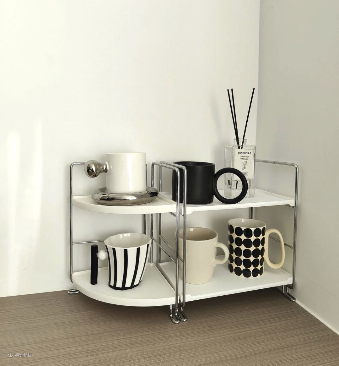首先是白+银的配色,简单而不单调,然后是形状不单一,除了以往的长方形置物架外,还多了三角弧形边的配置,这样一来,设计感更足,也更加灵活。