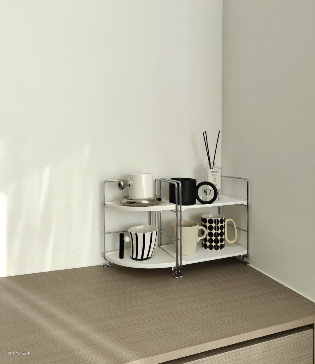 而有的小物件,外观还挺好看的,与其想办法把它收纳进柜子里,不如不给柜内增加负担,就陈列在台面上,好看还方便使用,比如杯子。
