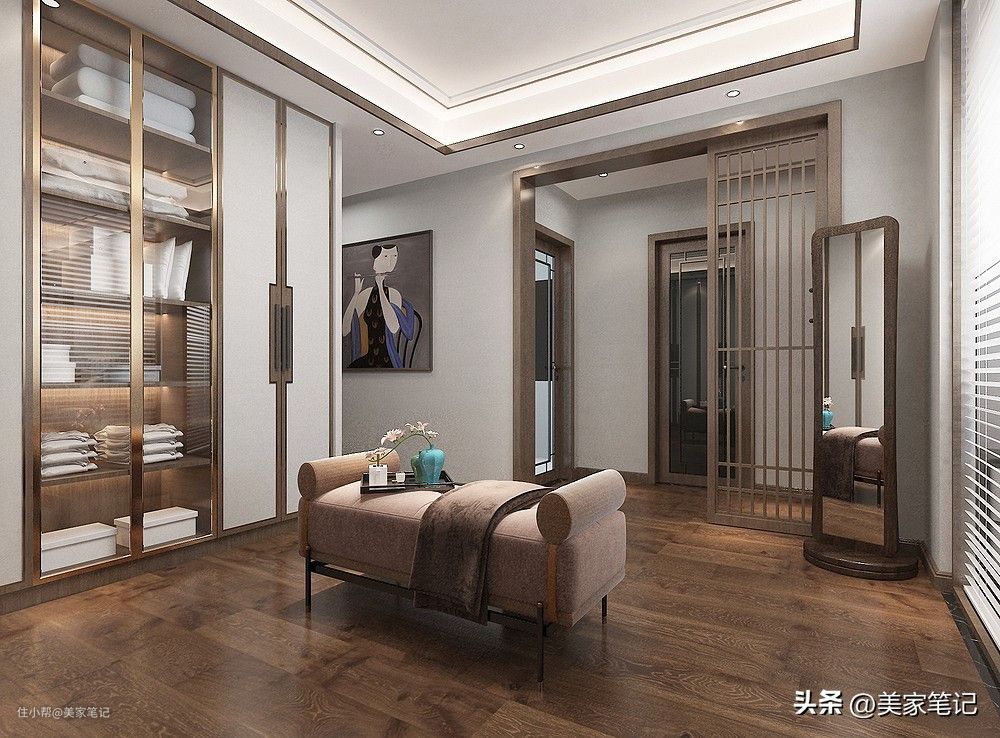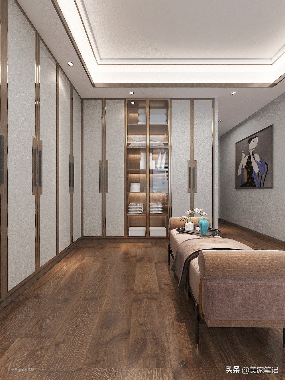 衣帽间区域相当于全家的公共衣帽间,精致时尚,且使用起来特别的 方便,金属边框与玻璃组合的柜门,看起来精致奢华,高级感十足。