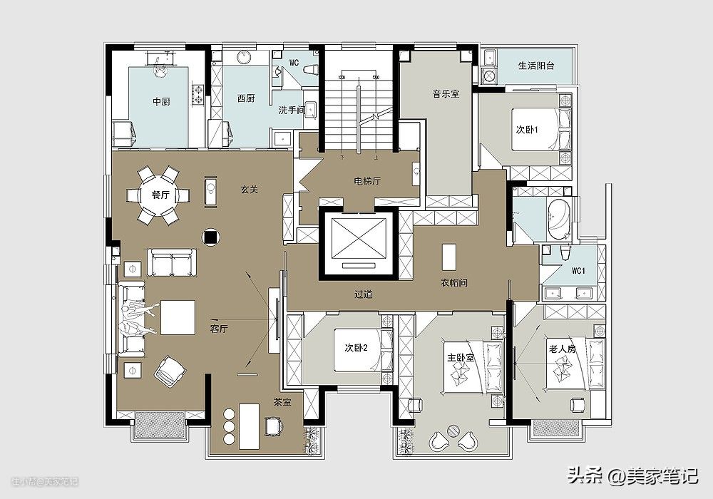 在平面布局保留了一个入户大门,将厨房、餐厅、客厅及茶室等公共区域设计在西边,以客厅隐形门至过道,作为动静分区的分界点,外界完全隔开,真正意义上做到动静分离,东边布局四个房间及一个影音室,在满足居家功能需求的同时,提升了生活品质。
