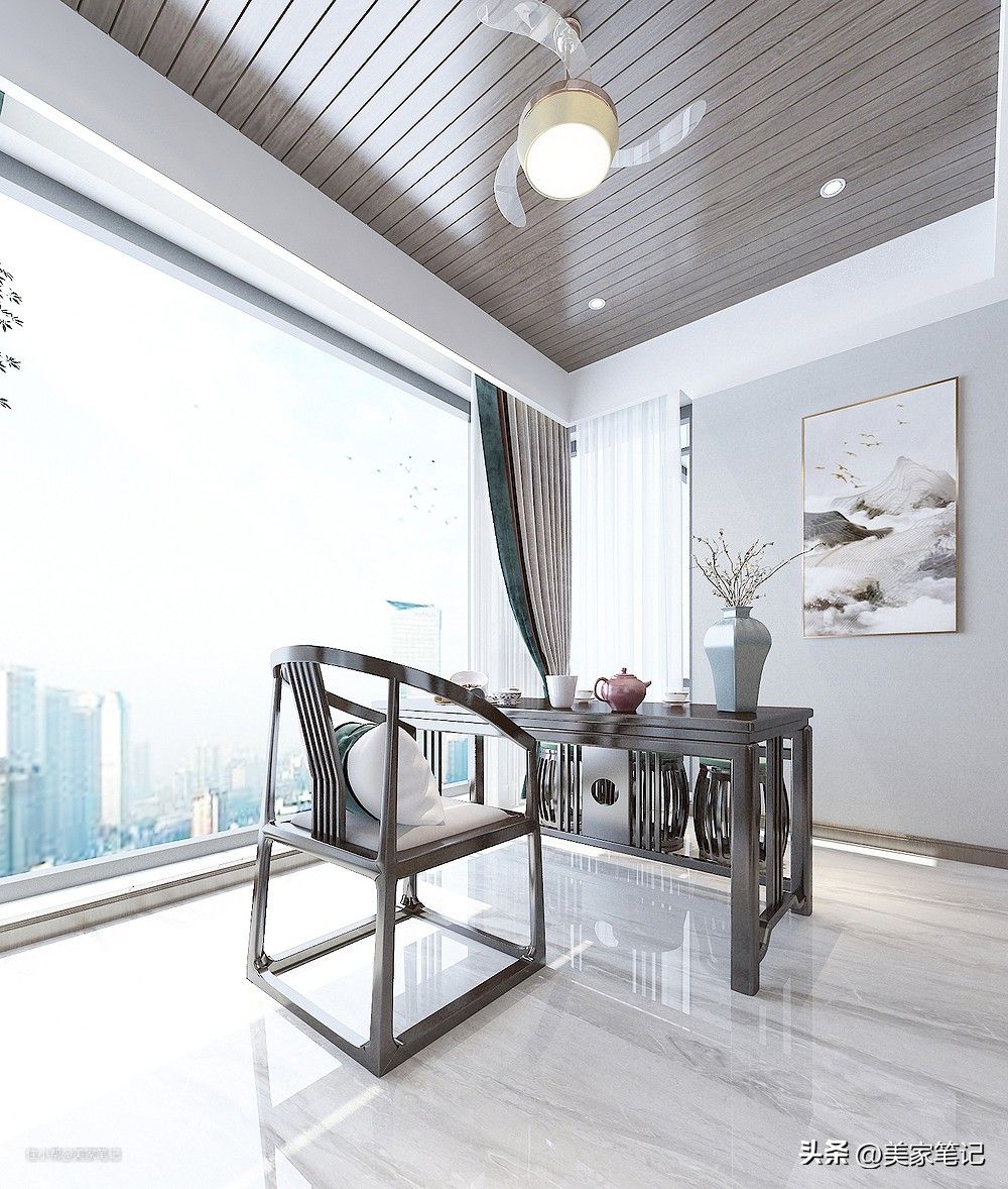 茶室作为客厅的附属空间,更多的是来作为采光点,尤其是那落地窗,更是让室外风景随时都能映入眼帘,虽然没有过度且繁杂的装饰,一张实木茶台就足矣,结合生态木的吊顶装饰,一股清雅舒适的氛围随之而来。