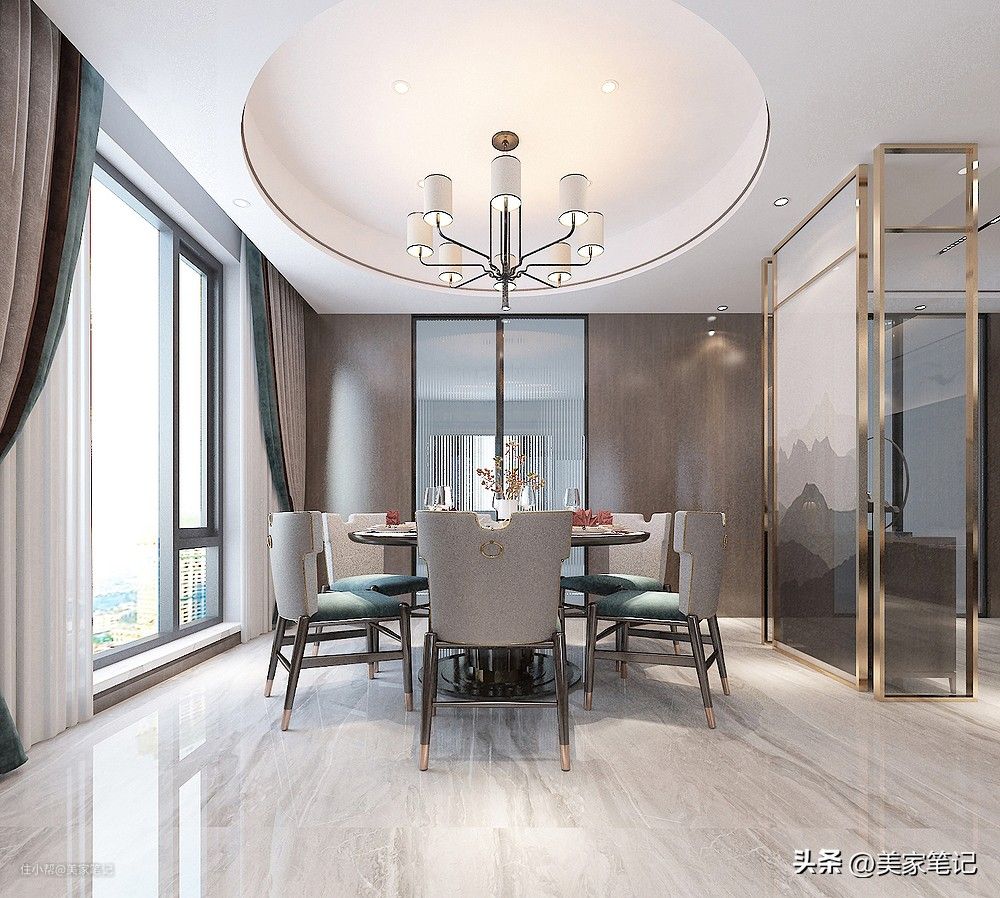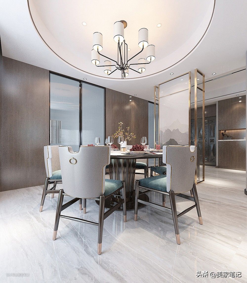 经过改造后的餐厅空间,宽敞且视野开阔,圆形餐桌与吊顶呼应,显得更加的大气,墙面设计浅咖色饰面板,厨房配以极窄黑色边框的长虹玻璃推门,与整个空间气质形成协调,时尚与传统并存,毫无违和感的与中式文化跨界融合。