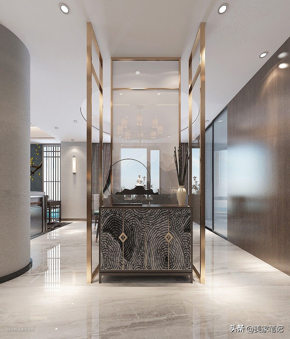 进门设计玄关区域,一组传统漆器手绘新中式玄关柜,雅韵十足,让进门就有一种眼前一亮的感觉,搭配金属与夹丝玻璃组合的屏风,形成进门与餐厅之间的端景,让空间感显得更加的高级。