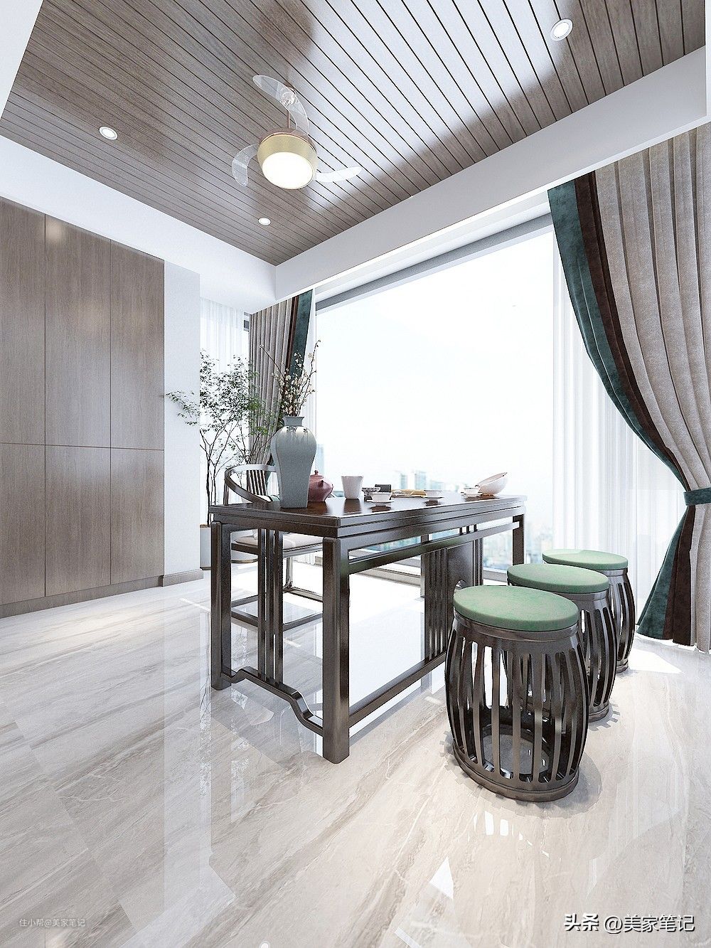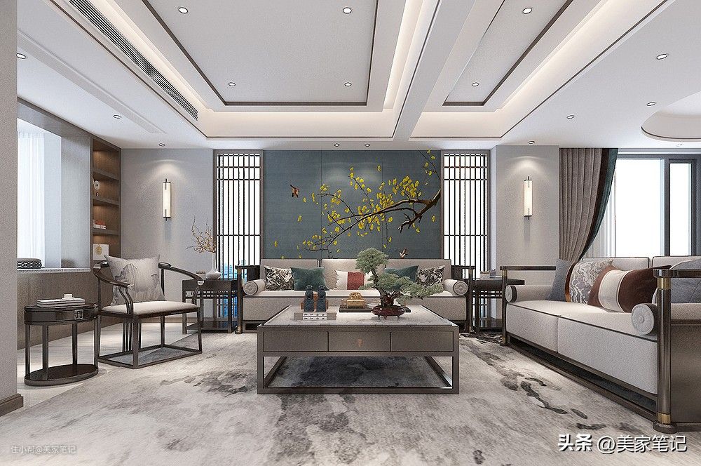 新中式风格,不仅在空间色彩上跳出了传统中式的深色系,融入现在较为流行的黑白灰,并且点缀红、黄、绿、蓝等宫廷色系,相比于单一的现代风格要显得更加的奢华优雅,可塑性强,且更有高级感。