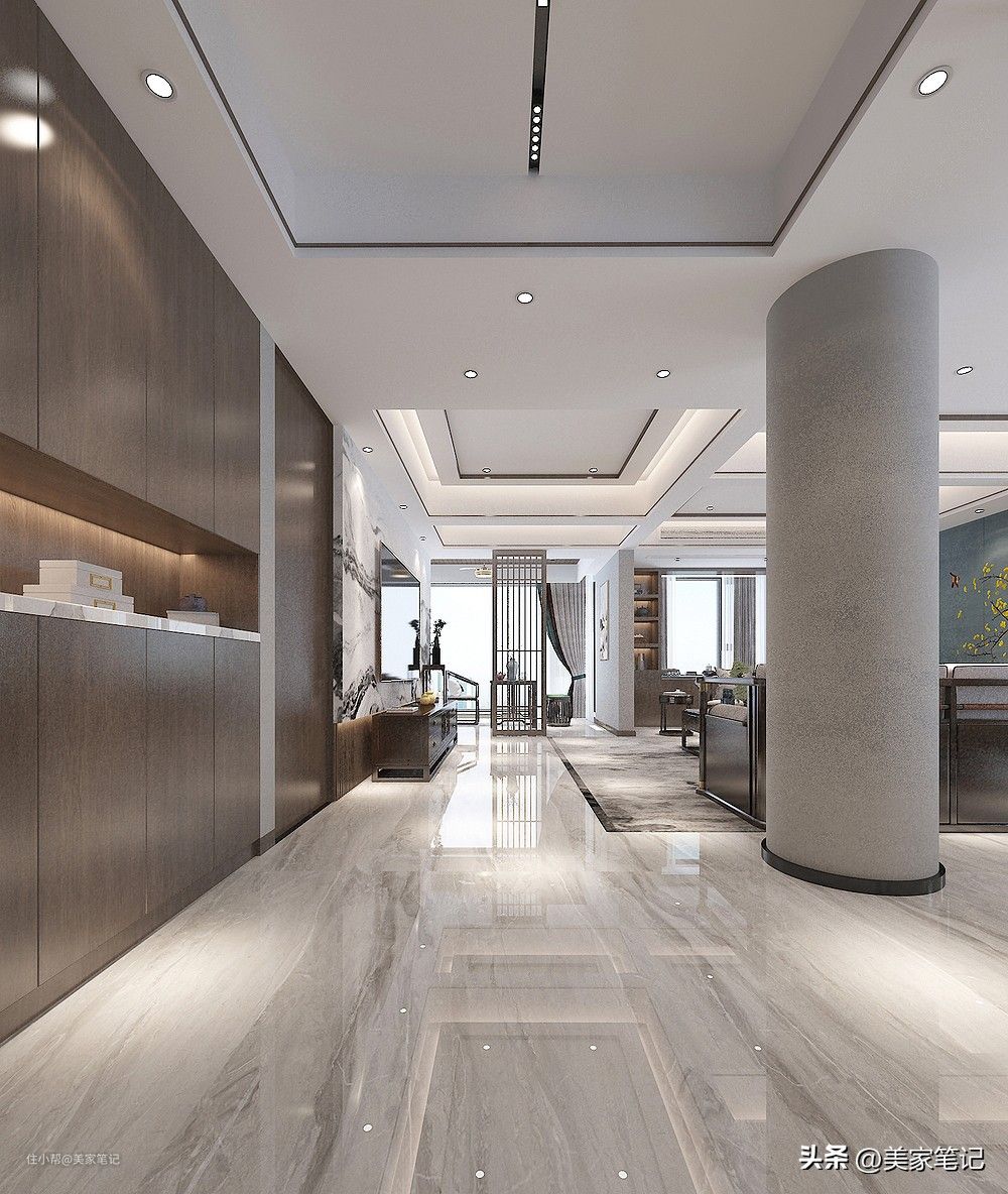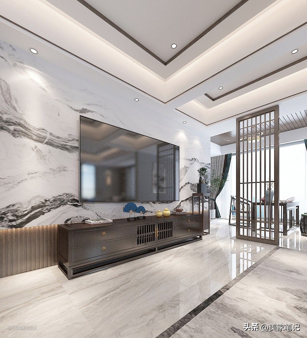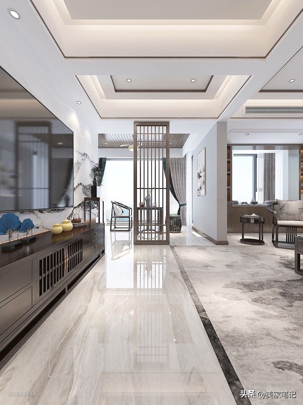 通往客厅的过道,简洁大气,嵌入式鞋柜与通往卧室区域的隐形门统一又协调,原本的柱子做了弧形处理,看起来没有那么生硬,再往前就是电视背景墙,整面的大理石岩板设计,不仅在视觉上显得大气,更是提高了空间档次,沙发背景则是以传统的花鸟壁画来作为装饰,两侧的实木格栅作衬托,内敛而又精致。