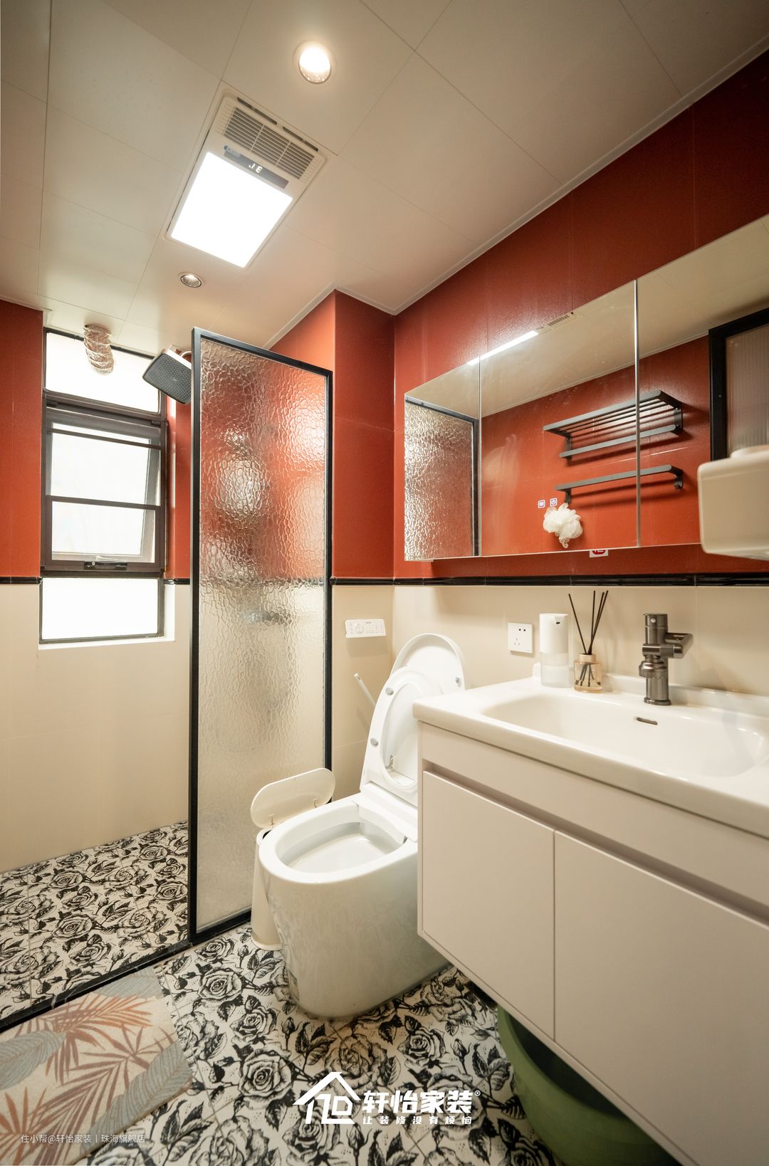卫生间里面是采用了两种不一样的色彩,上半墙是使用了复古红釉面瓷砖,下半面墙是奶黄色瓷砖,地面搭配黑白玫瑰花砖,演绎着法式的优雅,既复古调性又不失小清新感。悬挂式的洗漱柜+镜柜的设计,实现上下收纳,让卫生间的洗漱区实现收纳自由,而且悬挂式洗漱柜是与陶瓷一体盆的,不仅防水防潮耐腐蚀,还很节省空间,方便打扫卫生。