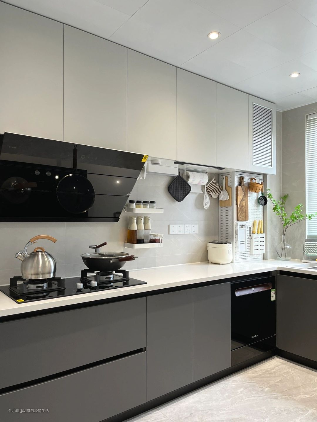 厨房面积不大,只有6㎡,采用了L型布局,以“黑白灰”为基调,合理规划了“洗切炒”三区。
