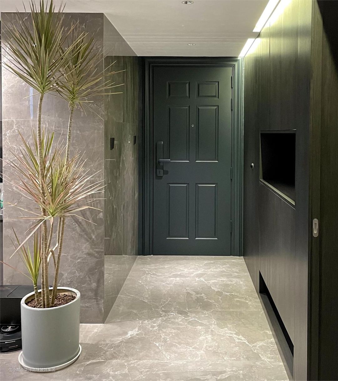 深色墙面与浅灰色地砖的搭配增加了空间的深度感,黑色大鞋柜则为家人提供了足够的储物空间。绿植则为整个玄关增添了自然的气息,让人感到舒适和放松。