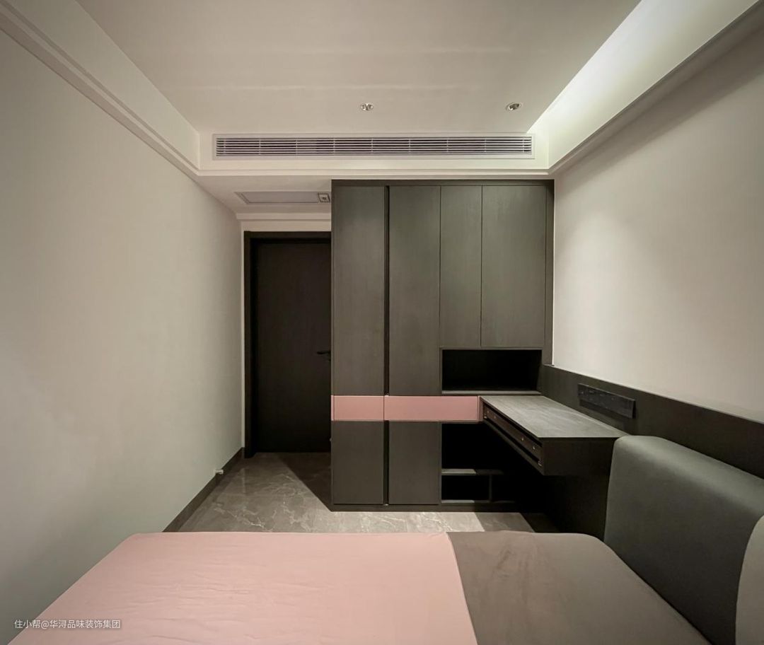 灰色皮质双人大床搭配粉色的床品,让整个房间看起来更加柔和和舒适。左边的灰色悬空书桌,既美观实用,而且也为房间增添了一份现代感。