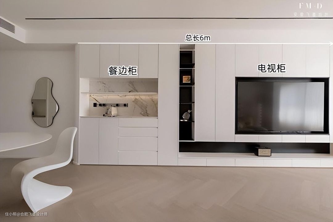 【滨湖印】这家就成了装修样板,客餐厅空间都有限,加上出于收纳最大化的考虑,索性就将电视柜、餐边柜连为一体,总长6m,感觉整面电视墙瞬间被拉长2倍!当然储物也随之翻倍,拉开平板柜门,内部用于存放日用品、零食等等,真的好拿好取。