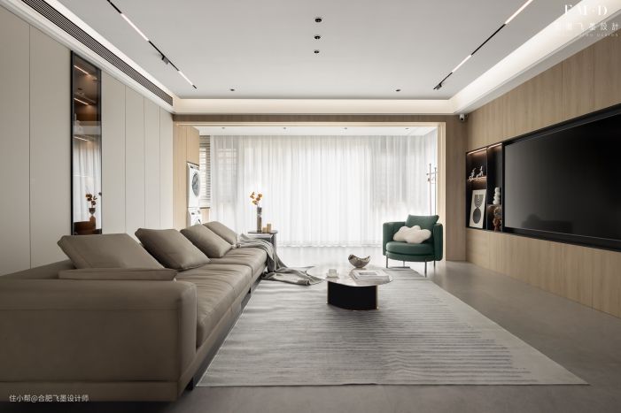 【文一豪门金地】这家处于硬装中,电视墙就面临太短的问题,为了整体比例更加协调,一不做二不休干脆将电视墙右侧打造成曲面造型,圆润线条包裹住阳台门垛,过渡更加自然,电视墙也被拉长,一举两得。