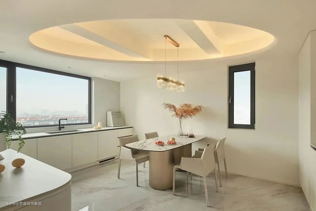 餐厅和厨房是一体化设计,通过相似的颜色和材质来打造流畅的过渡。使用白色的橱柜、柜台和墙面,与餐厅的整体配色相呼应,营造出一个连贯的空间感。