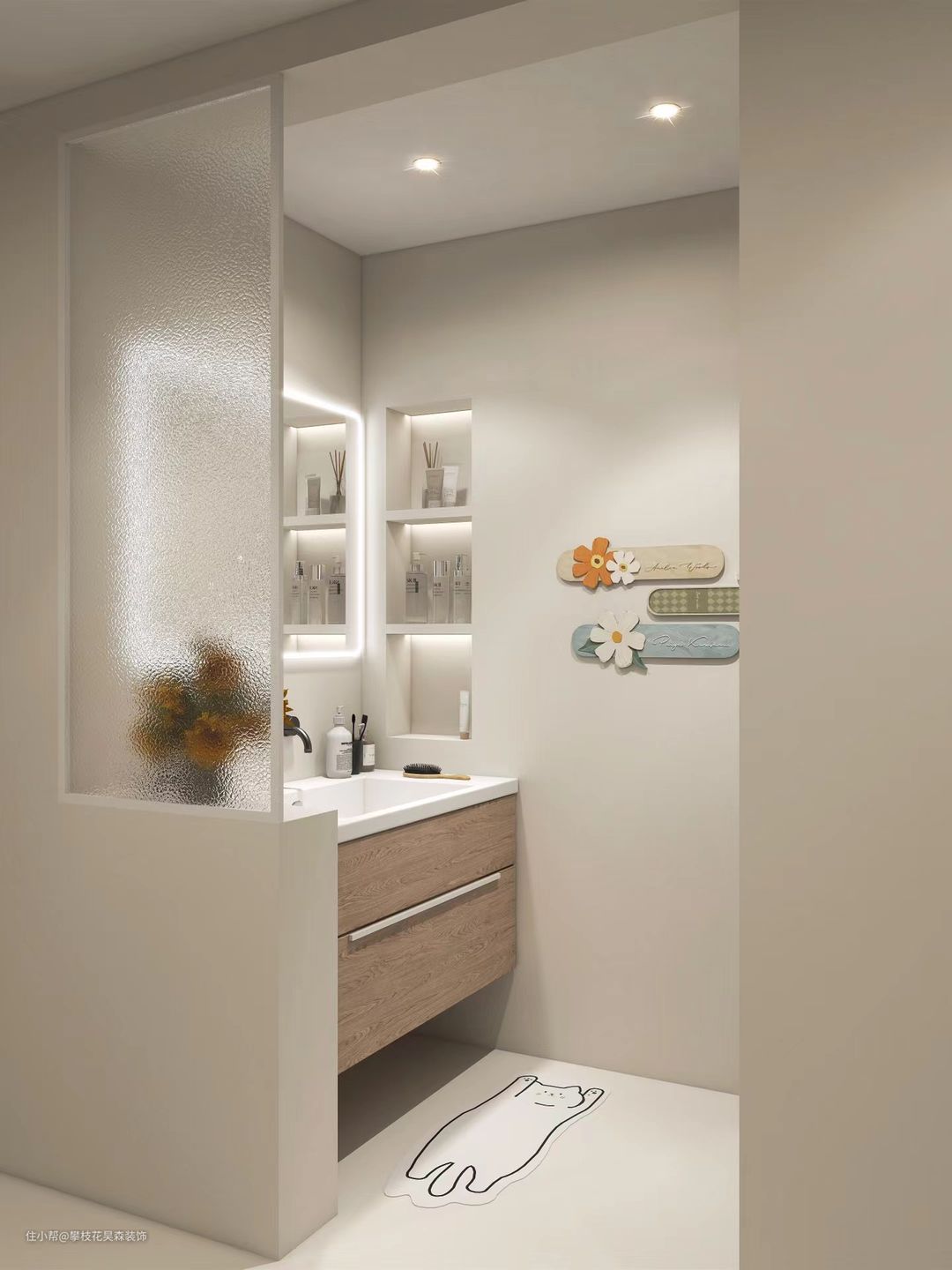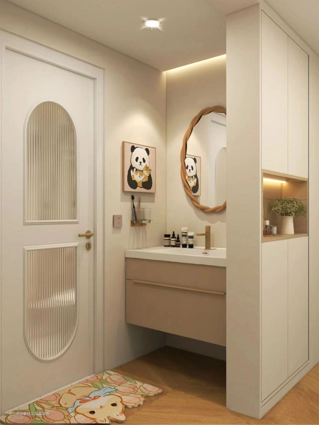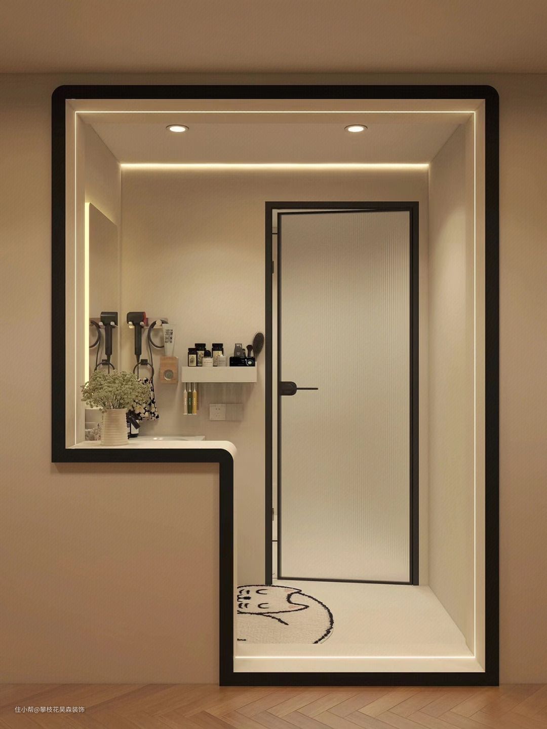 ③:温馨,更适合于女性的卫生间干区,采用的不在是传统的新建墙体半墙设计,取而代之的是半柜,不仅仅防止了洗漱时水外溅的情况(建议使用防水板材),同时增加的储物空间,墙面使用防水涂料,好处可以自由调色,达到自己想要的颜色,整体给人非常的温柔,温馨,舒适。