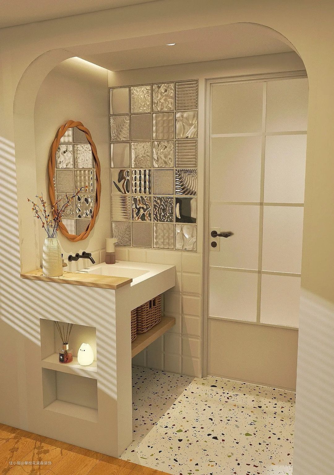 ①:拱形门洞,让视觉感和体验感更加的柔和,更让家更家温暖,再新建半墙的时候,在干区外部留了壁龛,不仅美观,同时还兼具着储物功能,平时可以放置一些展示品和香薰,洗手台以上位置使用的是艺术防水涂料跟整个空间形成整体,卫生间墙面位置使用玻璃砖进行点缀,让整体更加协调和舒适。