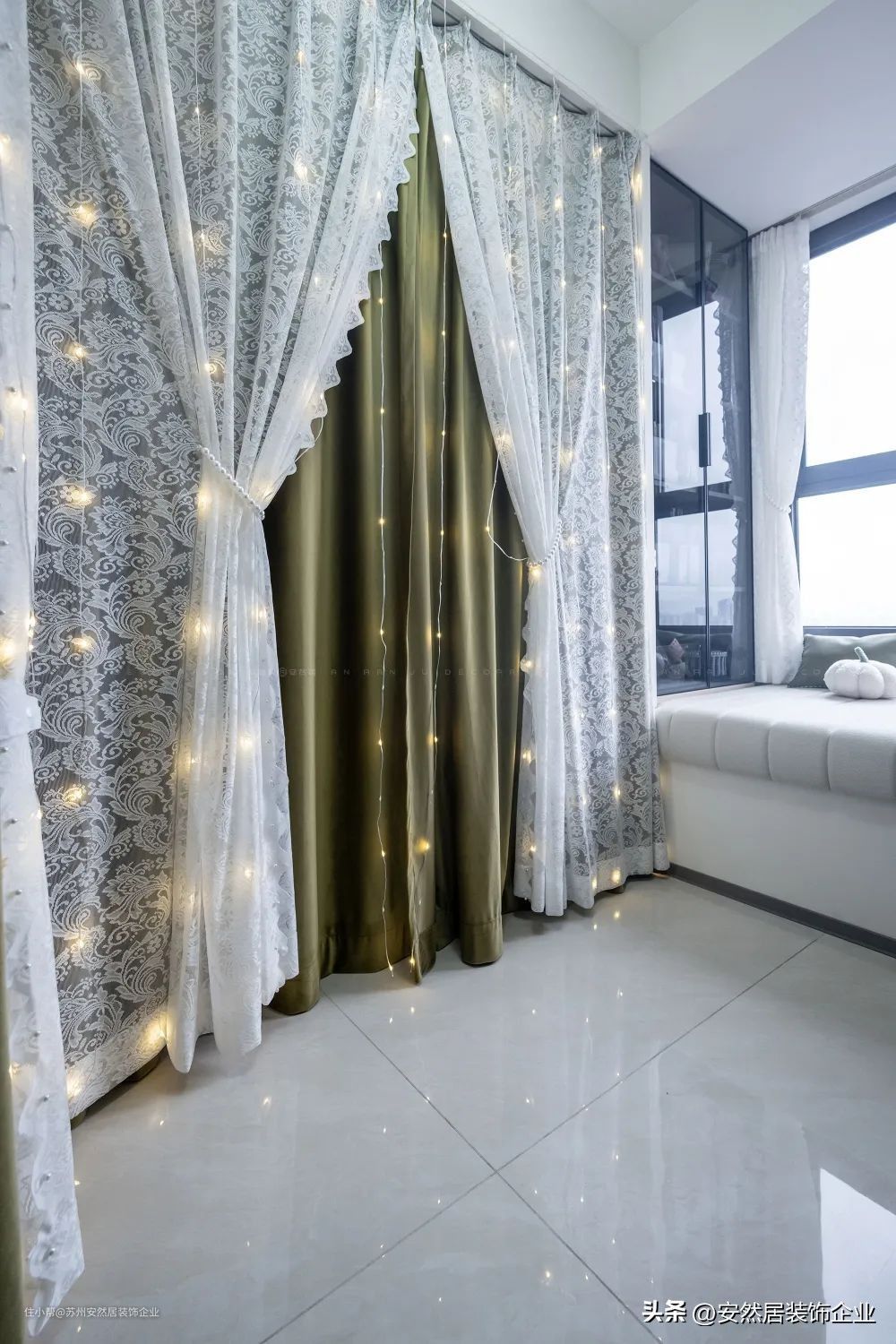 这个强烈安利:小姐姐不需要叠放的区域,依据尺寸在网上定制了不锈钢挂衣架,布帘在里侧,纱帘在外侧,留一点灯珠,一个简单但是实用的衣柜就完成了,最主要的是颜值颇高。