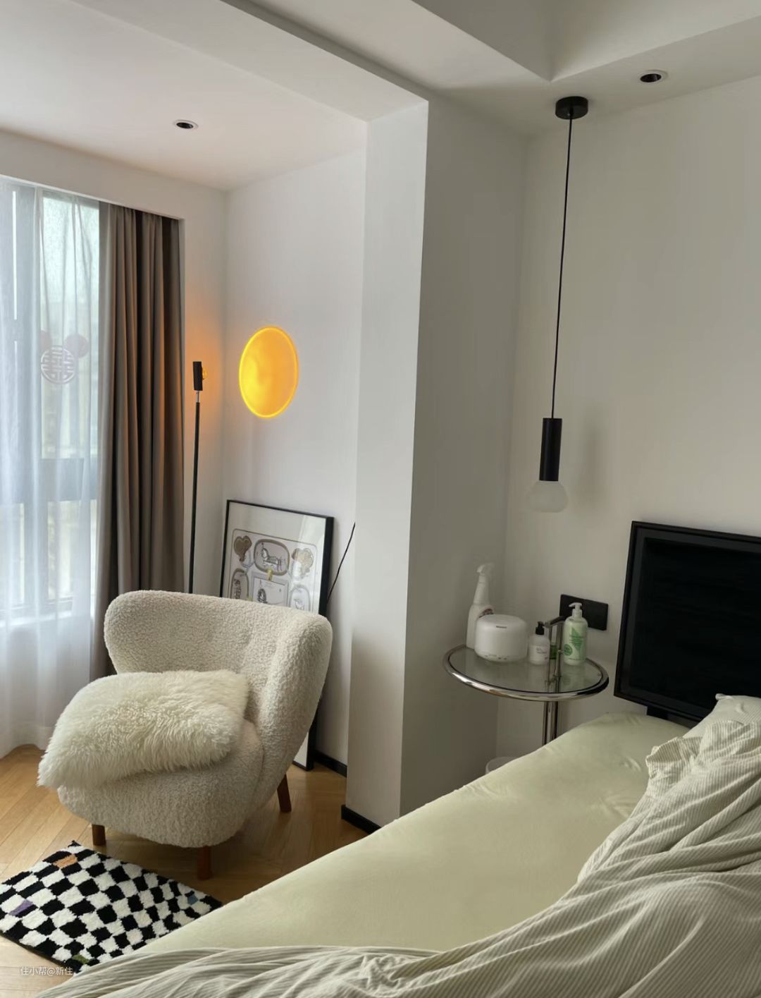 卧室如果不大,带来冲突感比较明显的还有床头柜,曾经一度标配的一床两柜,到了我们这代,好像成了“没有用”的东西。
