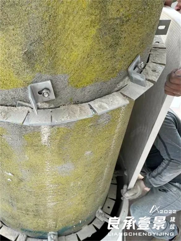具体做法需要将石材根据大小尺寸纹路提前定制,材料到场后进行预排,然后在圆柱上做好铆固点,再衔接固定好石材。
