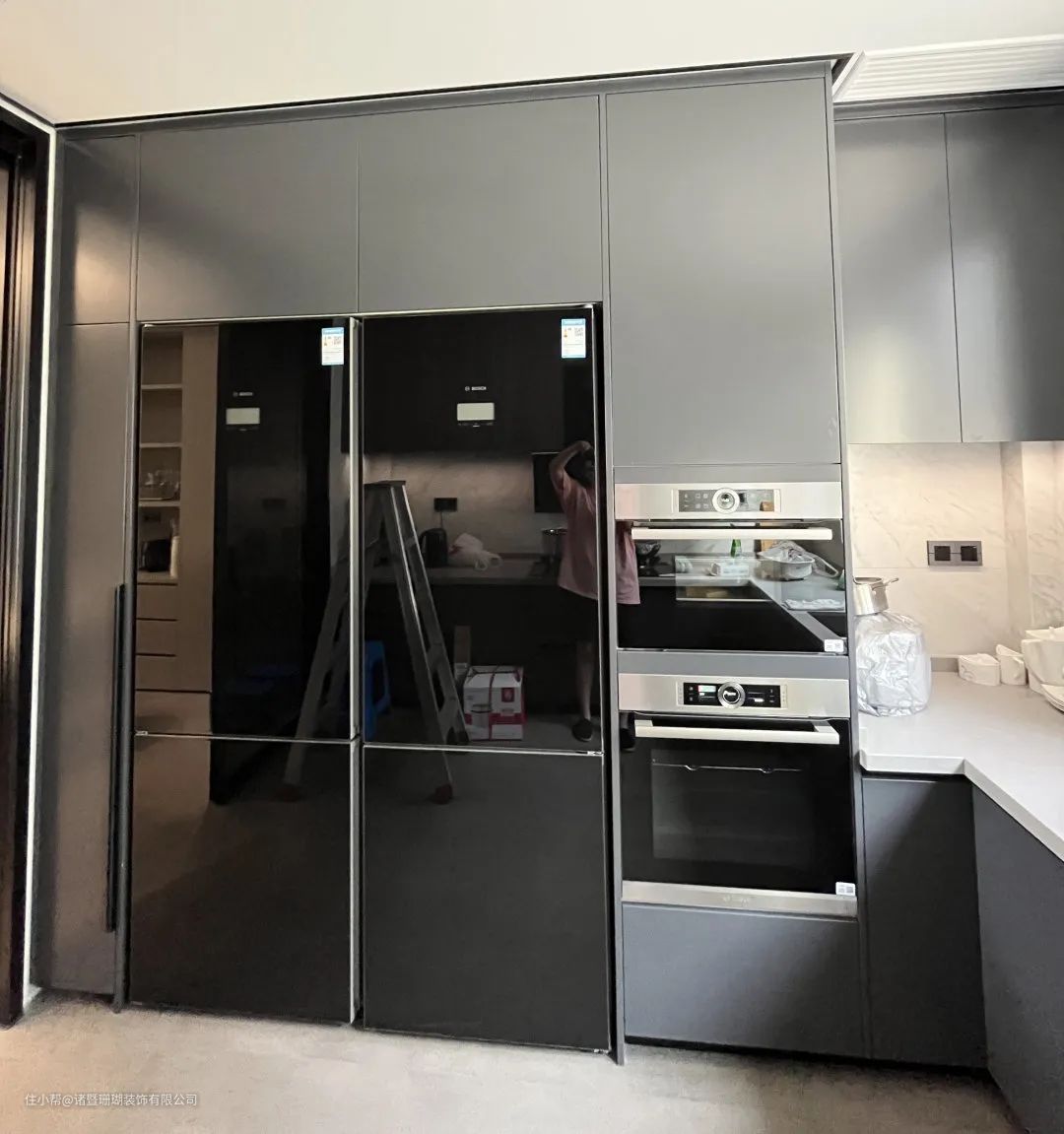 内嵌双开门冰箱与各类厨电,干净利落功能齐全