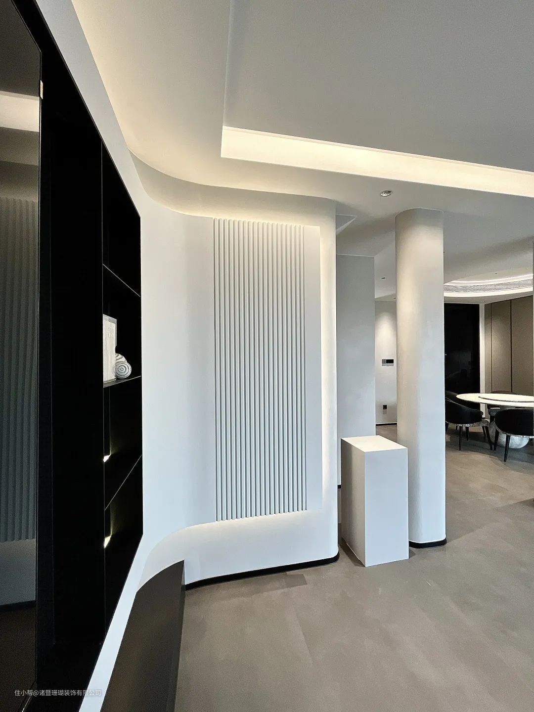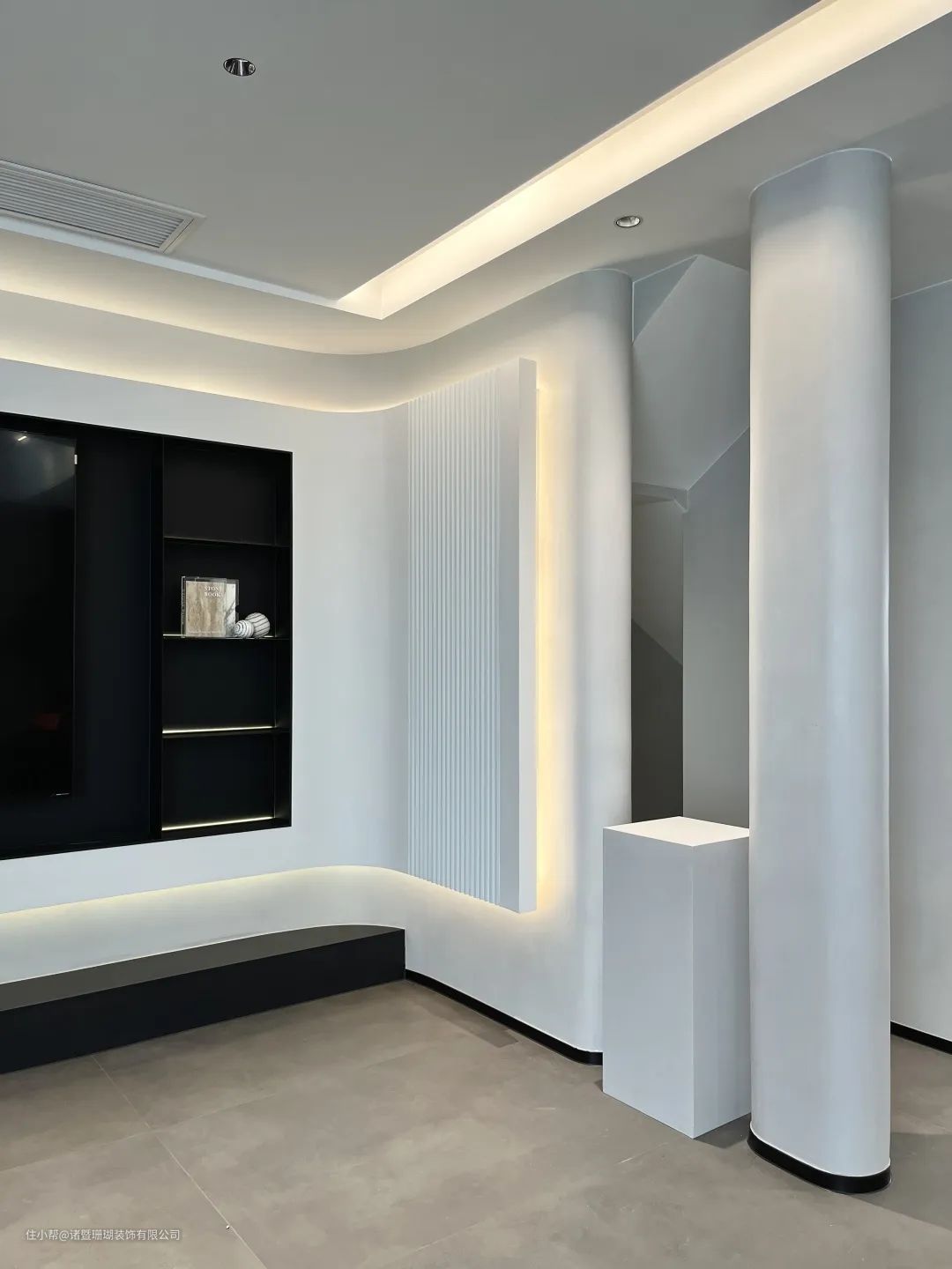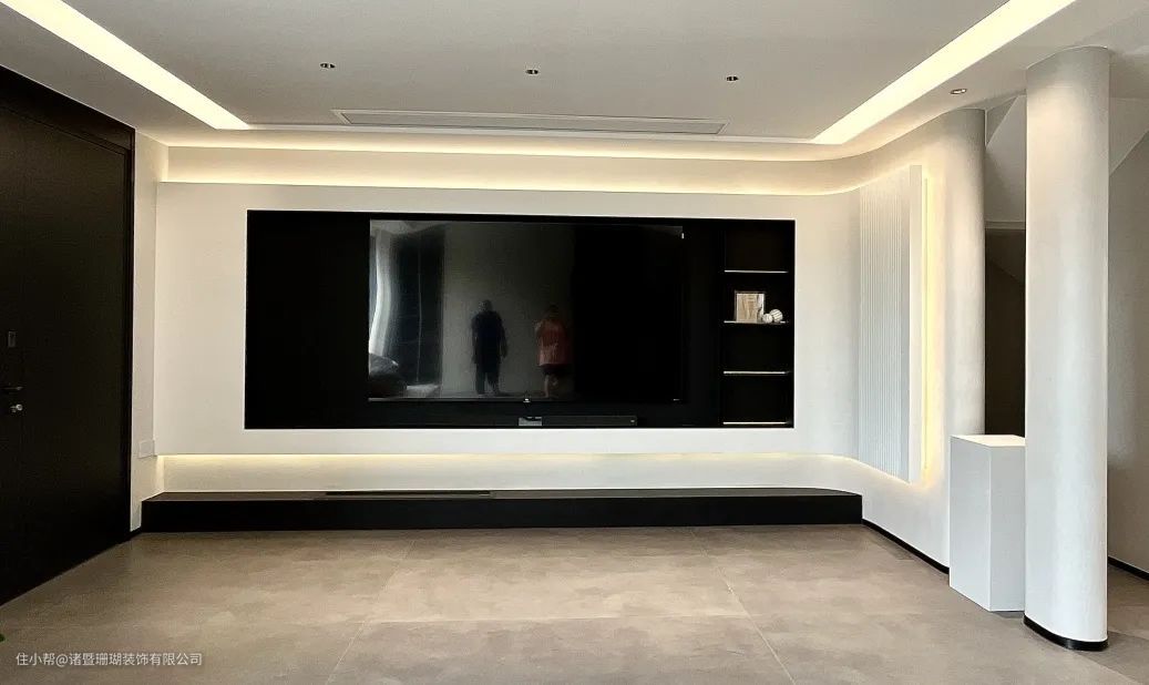 弧形背景墙营造“悬空”既视感,嵌入氛围灯带