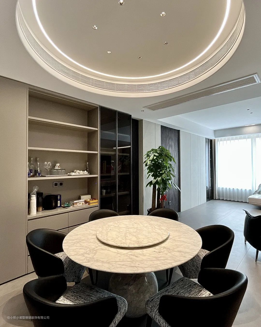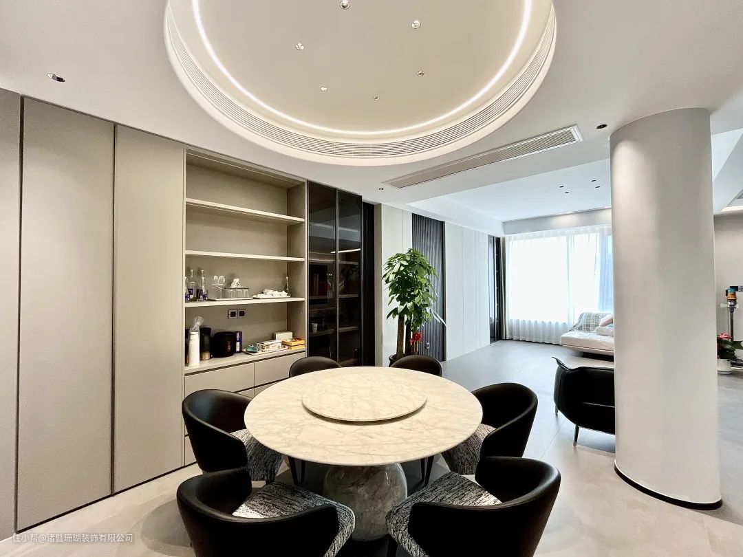 极简岩板餐桌搭配黑色布艺餐椅,圆形吊顶增加空间聚拢感