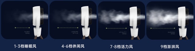 舒乐氏XF2空气循环扇支持9档调节,其中最强风速高达7m/s,非常强劲,可以达到室内空气快速流动的效果。9档调节也非常丰富,根据官方的分类可以分为睡眠风、休闲风、活力风和澎湃风,在风力大小、风量、风速和噪音方面也会有所区别,大家根据需求调节即可。